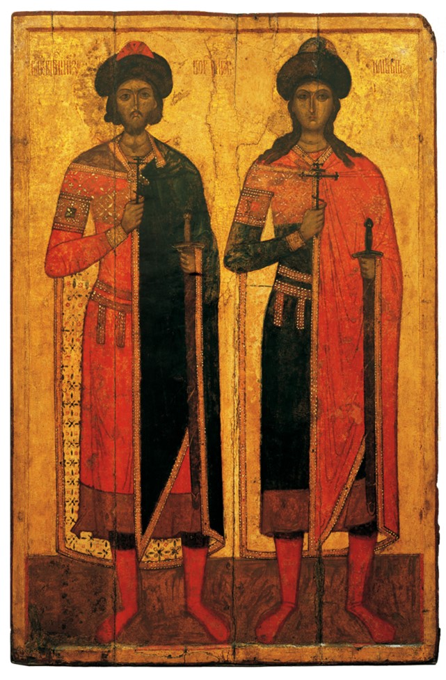 Na sliki desno: Sveta knežja brata Boris in Gleb (umorjena leta 1015), novgorodska ikona iz 14. stoletja (Ruski umetnostni znanstveno-restavratorski center, Moskva)